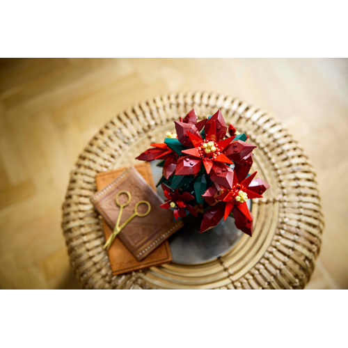 This posable LEGO replica depicts a ‘Grande Italia Plant' (Poinsettia) nestled in a woven-basket flowerpot and features green leaves and 5 clusters of vibrant red leaves (bracts) with yellow cyathia at the center. Easy to assemble, it delivers a rewarding building experience and makes an elegant holiday centerpiece decoration for the home and office.